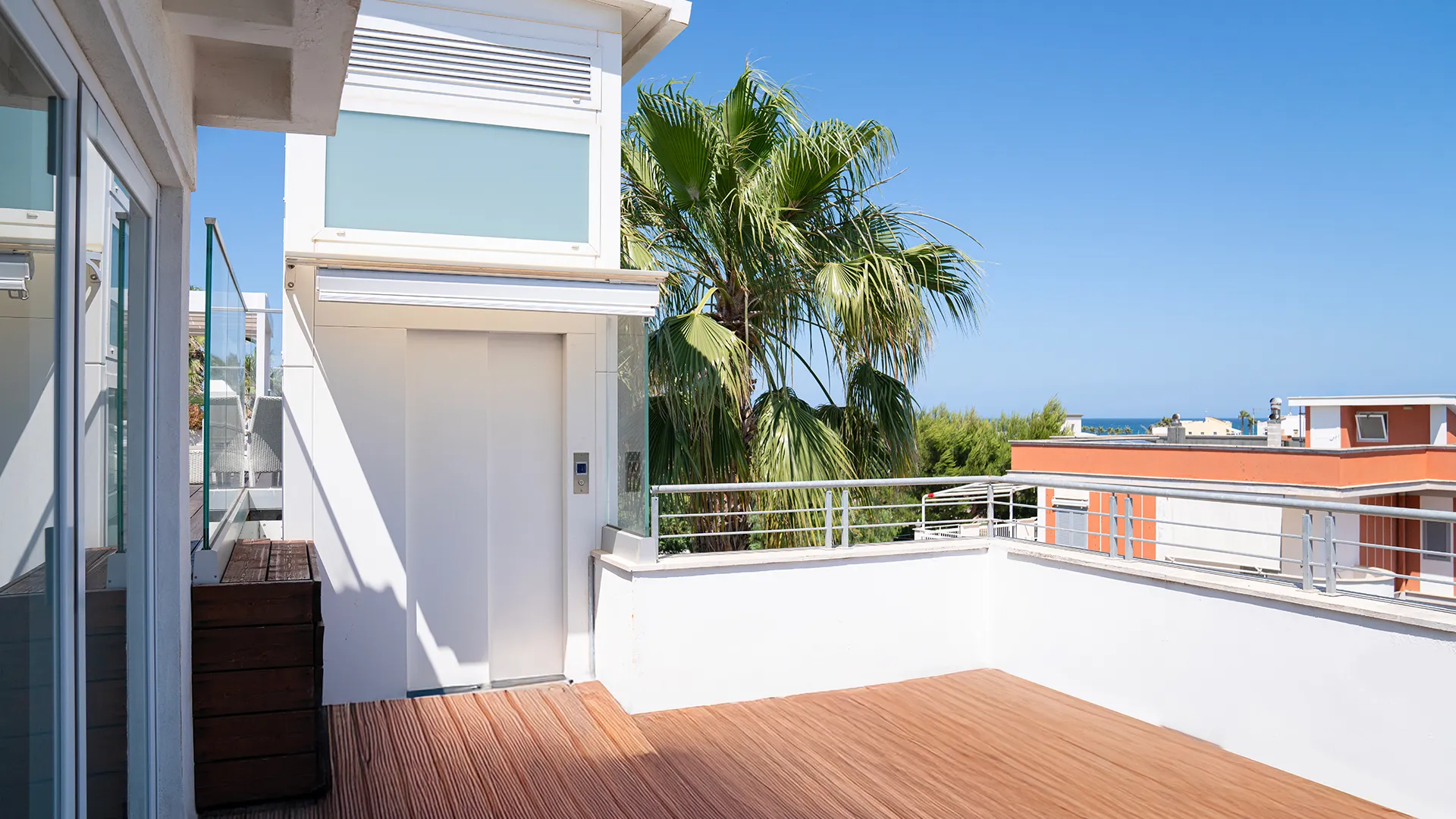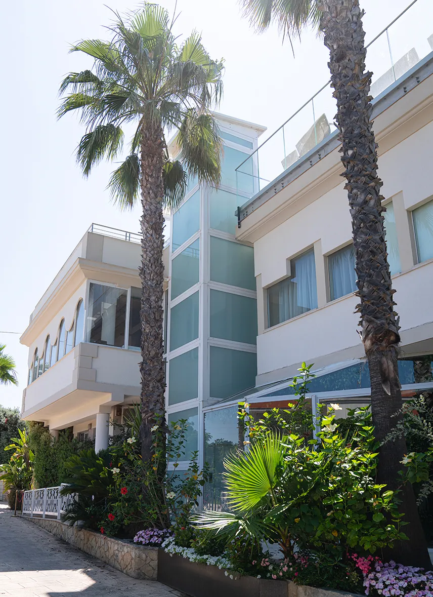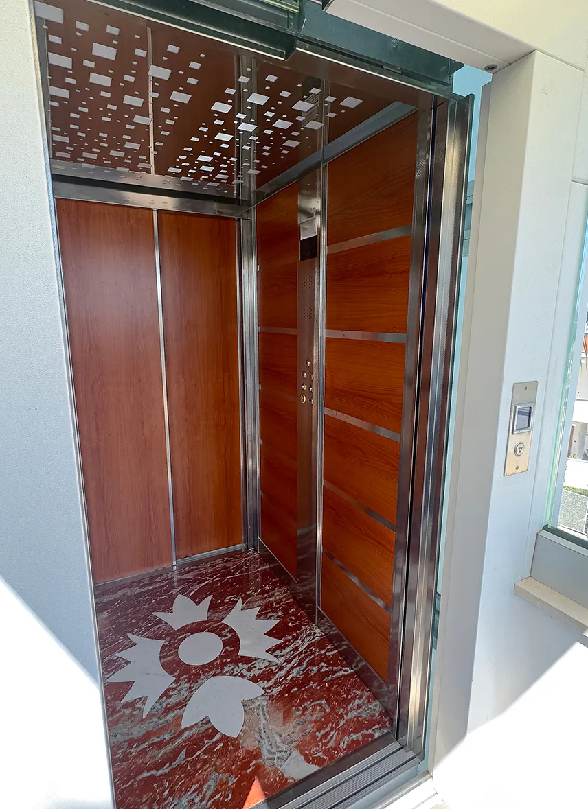 Per una sala ricevimenti è stata sviluppata una soluzione di ascensore MRL in struttura metallica esterna, progettata per collegare i piani con sbarchi interni all’edificio. La configurazione consente un’integrazione funzionale ed estetica con l’architettura esistente. La cabina, caratterizzata da modanature in metallo inciso e pavimento in marmo intarsiato, contribuisce a valorizzare l’accesso agli spazi dedicati all’accoglienza e agli eventi.